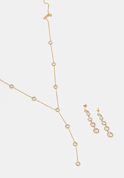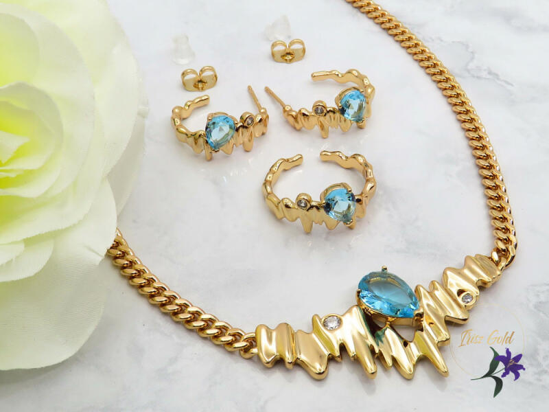 Meseszép köves szett . Nyaklánc , fülbevaló és gyűrű Szin: 18 Kr Méret: Lánc: 45+ 3 cm Medál: 5 cm / 2,5 cm egybe a lánccal. Gyűrű : 55-60-es méretre ajánlott Fülbevaló karika 2 cm / 1 cm Bedugós A forgalmazott divatékszerek alapanyaga nikkel és ólommentes ezért többnyire nem okoznak allergiás tüneteket, nyugodtan hordhatják fémérzékeny emberek is. Általában nem sz