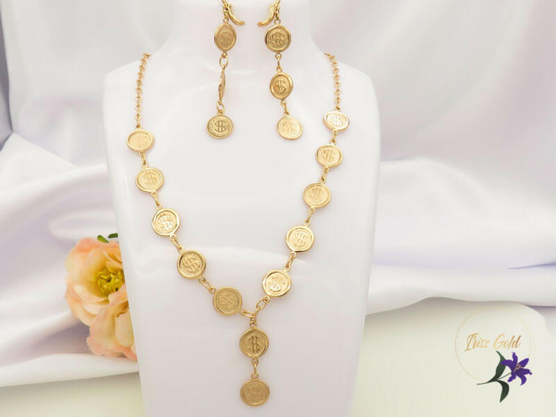 Antiallergén mutatós szett dollár érmékkel, nyaklánc, csüngős fülbevaló Szin: 18K Méret: lánc 45+4cm Fülbevaló: 60 mm Érmék: 10x10 mm Fülbevaló zár karika bepattintós A forgalmazott divatékszerek alapanyaga nikkel és ólommentes ezért többnyire nem okoznak allergiás tüneteket, nyugodtan hordhatják fémérzékeny emberek is. Általában nem színezik a bőrt és más diva