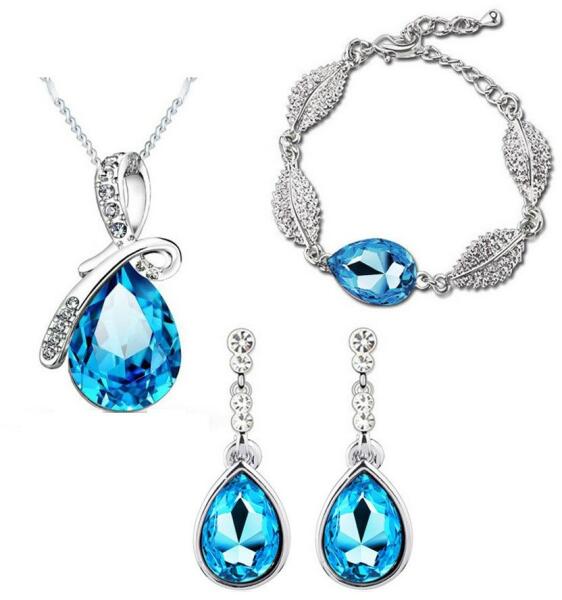 Cikkszám: 0588 3 részes ékszerszett: - kék színű ausztriai kristályokkal, - ezüst színű bevonattal, - állítható hosszúságú nyaklánccal ( 40 cm - 45 cm ). A beszúrós, függő fülbevaló mérete: 4 cm x 1 cm . Medál mérete: 3 cm x 1,6 cm. Karlánc mérete: 13,5 cm + 5 cm (állítható). Elegáns, egyedi kristályos ékszerszett ! A megadott méreteket kérjük vegyék figyelemb