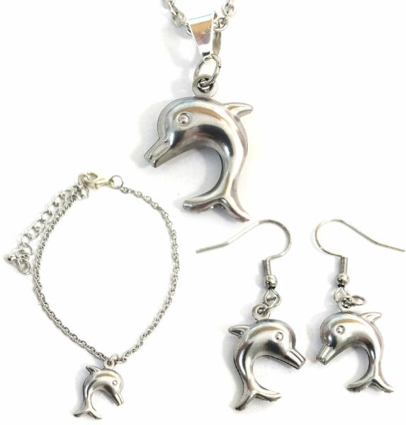 Delfines nyaklánc, fülbevaló és karkötő szett. Paraméterek: Medál / mérete kb. 2 cm. Anyaga fémötvözet. Fémrészek anyaga rozsdamentes acél. Elegáns, nem hivalkodó, diszkrét. – Lánc hossza 50 cm. (Ha ettől eltérő méretben szeretnéd, írd be megjegyzésbe!) – Karkötő hossza kb. 17+5 cm. (Ha ettől eltérő méretben szeretnéd, írd be megjegyzésbe!) – A fülbevaló
