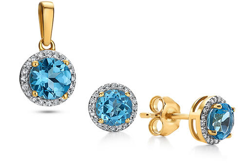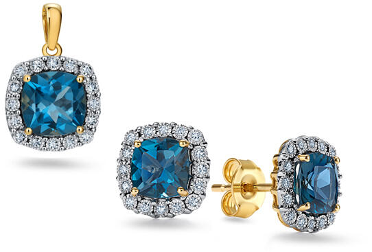 A sárga aranyba foglalt természetes topázzal és gyémántokkal díszített szett kialakítása tökéletesen kiegészít minden öltözéket. A briliáns csiszolású gyémántok kiváló csiszolásukkal és szimmetriájukkal egyedülálló csillogást kölcsönöznek. A sárga arany és a kék topáz kombinációja miatt ez az ékszer ideális választás a világosabb bőrtónusú, szőke va