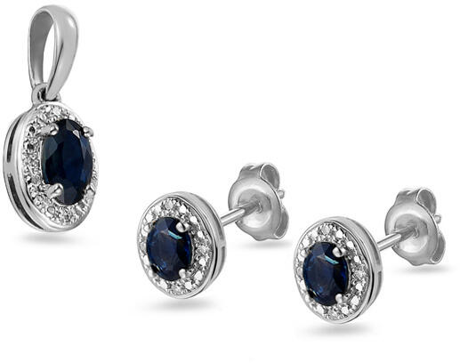 Zafír szett 14 karátos fehéraranyból, fülbevalókból és medálból áll. A készletet sötétkék drágakő díszíti - 0,700 ct súlyú zafír és gyémántok, amelyek 0,030 ct össztömegű H színnel és SI1 tisztasággal veszik körül.