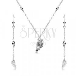 A szett 925 ezüstből készült, nyaklánc medállal és fülbevalóval. A lánc egymásra merőlegesen forrasztott ovális szemekből áll. Angyalszárny medál díszíti, amely szabadon mozog. A láncon kétoldalt egy-egy golyó rögzített. A nyakék delfinkapcsos. A fülbevaló ovális szemekből álló láncból épül, amely angyalszárnyban végződik, és a középen egy sima, tükörfén