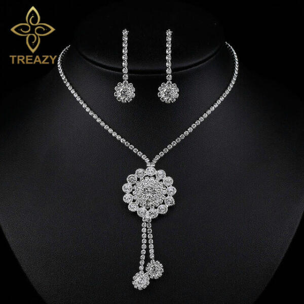 Gyönyörűen csillogó kristályokkal kirakott nyaklánc és fülbevaló virág motívumos szett. Esküvői ékszernek is tökéletes, de bármilyen különleges alkalomra megfelel. Anyaga fémötvözet és kristály. Nyaklánc mérete: 34 + 17 cm. Fülbevaló mérete: 2,3 x 0,9 cm. Egy jól megválasztott ékszer öltöztet, feldobja a napodat, valahányszor ránézel, jobb kedvre derülsz. A sz