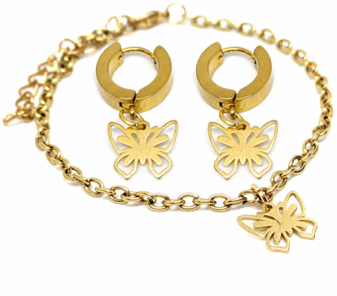 Nemesac l pillangós karkötő és fülbevaló szett. Letisztult karkötőn kifinomult pillangó charmmal, hozzá illő fülbevalóval. Egyszerű, mégis különleges ékszerszett. Paraméte rek: Charm mérete kb. 1,1 cm. Anyaga nemesacél. Karkötő mérete 17+5 cm. (Ha ettől eltérő méretet szeretnél, rendeléskor a MEGJEGYZÉSBE írd be. ) Fülbevaló kb. 2,2 cm.
