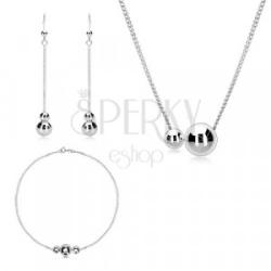 925 ezüst szett nyakékből, karkötőből és fülbevalóból. A nyakéken két fényes golyó alakú medál helyezkedik el. A lánc ovális szemekből áll, minden láncszem egymásba kapcsolódik. A golyók a láncon mozgathatók. A karkötő, szintén ovális szemű láncból áll és három mozgatható golyó medál található rajta. A nyaklánc és a karkötő zárszerkezete delfinkapcsos.