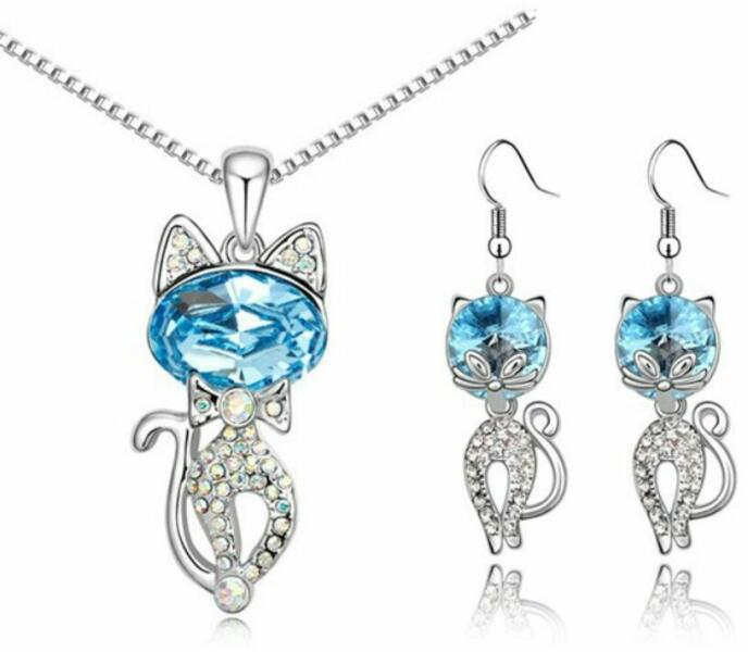 Óceánkék cicás fülbevaló és nyaklánc szett. Kicsi lányoknak csillogó ékszer, nagyobb lányoknak trendi poén, még nagyobb anyukáknak vagány megjelenés, nagyiknak pedig egy klasszikus üzenet Aradszky Lászlótól: Nem csak a húszéveseké a világ!Medál mérete: kb. 4,2x2 cm. A lánc mérete: kb. 45 cm. Egy jól megválasztott ékszer öltöztet, feldobja a napodat, valahányszor