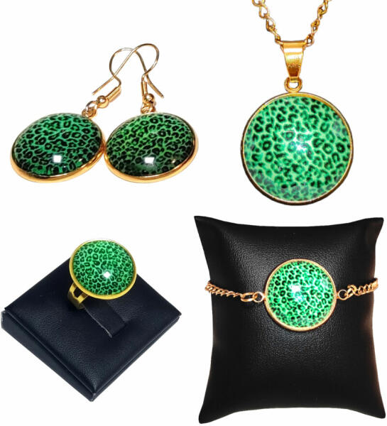Leopárd mintás (lánc, karkötő, fülbevaló, állítható gyűrű) szett, választható arany és ezüst színben. Egyedi, szép, kézzel készült üveglencsés ékszerszett, akár ajándékba is ideális. A szett tartalma: medál lánccal, fülbevaló, karkötő, állítható gyűrű. Rendelhető arany és ezüst színekben. Válaszd ki a listából, hogy arany vagy ezüst színben, és mily
