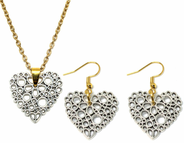 A lánc mérete 50 cm, ha más méretet szeretnél, írd be rendeléskor a megjegyzésbe, milyen méretben kéred. Virágos Szív medál lánccal és fülbevaló szett. Paraméterek: Medál mérete 2,5x2,3 cm. Medál anyaga fémötvözet. Fülbevaló akasztó rozsdamentes acél. Nyaklánc rozsdamentes acél: hossza 50 cm (ha más méretet szeretnél, Megjegyzésbe írd be).
