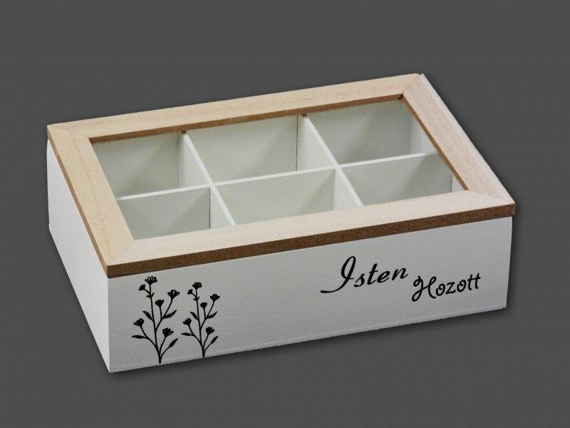Teásdoboz Isten hozott 6 fakkos fehér 23x15cm 04790 Ez a gyönyörű fa teásdoboz 6 rekeszes, Isten hozott feliratozású, fehér/natúr színű, virág dekorációval az oldalán, mely nem csak teafilterek tárolására alkalmas, hanem lakásdekorációnak is kiváló. Befoglaló méretek 23x15x7 cmAnyaga fa, üveg
