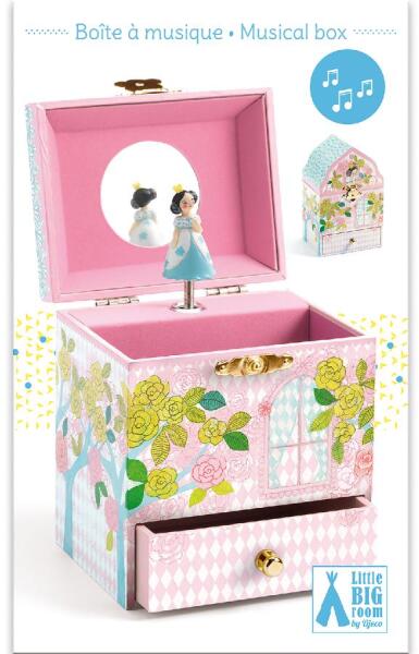 Álomszép, palotát formázó, ékszertartó, zenélő doboz. Miközben a balerina körbe táncol a zenére, kiválaszthatod, hogy melyik ékszereidet szeretnéd aznap felvenni. A zenedoboz fából készült, belseje plüss bevonatú. Alul egy kis fiókocska is található, ahol szintén lehet fülbevalókat, karkötőket és nyakláncokat tartani. A kis balerina műanyagból van. Muzsika: Wolfga