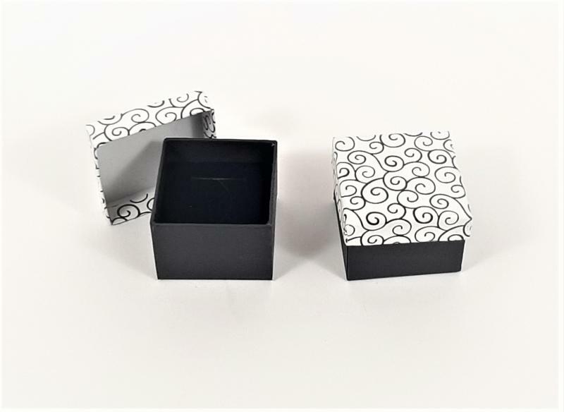 Papir ékszerdoboz, alsó része fekete, felső része fekete-fehér kacskaringós mintával. Belül fekete párnácska, melybe ültethető az ékszer. Gyűrűhöz és fülbevalóhoz egyaránt jó. Mérete: 45x45x35 mm