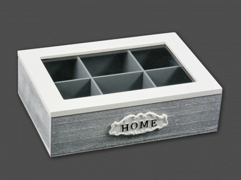 Teásdoboz Home 6 fakkos szürke 24x17cm 04615 Ez a gyönyörű fa teásdoboz 6 rekeszes, Home feliratozású, szürke/fehér színű, mely nem csak teafilterek tárolására alkalmas, hanem lakásdekorációnak is kiváló. Befoglaló méretek 24x17x7 cmAnyaga fa, üveg