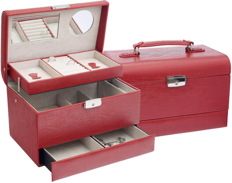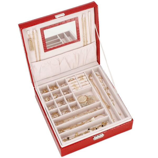 Ékszeres doboz HA1027Alapvető jellemzők:Márka anyag: öko bőr + velúr + MDFtok színe: piros + dekoratív kivitelbelső szín: világos rózsaszínszarvasbőr belsőzár típusa: kulcsBelső tok:12x kis rekeszek: 3 x 3 cm3x rekesz: 17,5 x 2,5 cm2x rekesz: 23,5 x 2,5 cm1x rekesz: 6,5 x 6,5 cm2x gyűrűs rekesz: 6,5 x 3,5 cmtükör: 11 x 8 cm4x akasztókampó1x szövetzseb: 25 x 9,5 cm2. szint