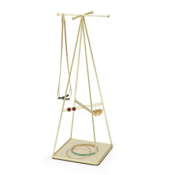 Elegáns, piramis alakú ékszertartó állvány matt arany kivitelben, amely tökéletes megoldást nyújt nyakláncok, fülbevalók és gyűrűk tárolására és bemutatására. A len alapú tálca és a többszintes kialakítás praktikus tárolási lehetőséget biztosít minden ékszer típushoz. Stílusos és praktikus ékszertartó megoldásA Prisma ékszertartó állvány egy modern és e
