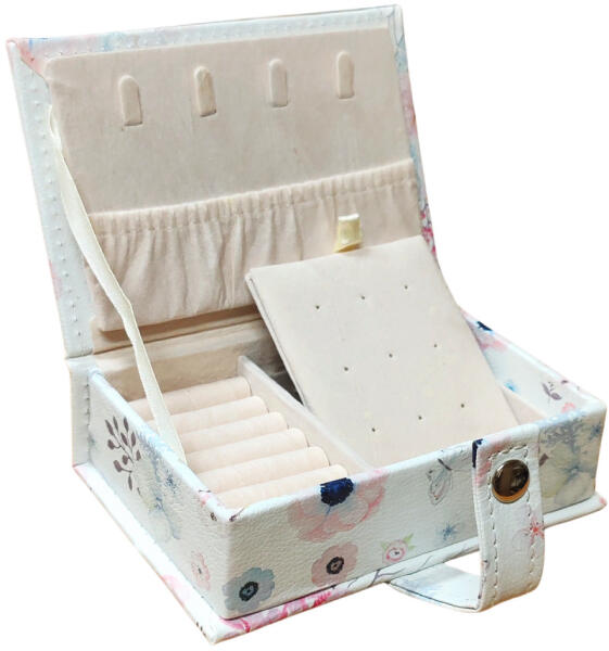 Praktikus és különleges virág és madárka mintával díszített ékszerdoboz. Több rekesz található benne, ami lehetővé teszi különböző méretű ékszerek tárolósát, így könnyen rendszerezheti nyakláncait, gyűrűit, fülbevalóit és karkötőit. Puhán párnázott belső rész, melynek köszönhetően ékszerei karcmentesek és sértetlenek maradnak. Az ékszerdoboz patenttal