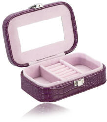 Lila műbőr ékszerdoboz krokodilbőr mintával fényes felülettel. Belsejében egy tükör és 3 rózsaszín-lila rekesz található az ékszerek számára. A középső rekesz puha párnákkal van kitöltve, és fülbevalók vagy kisebb ékszerek számára alkalmas. Az ékszerdoboz csattal záródik. Az ékszerdoboz méretei: 145 x 95 x 45 mm