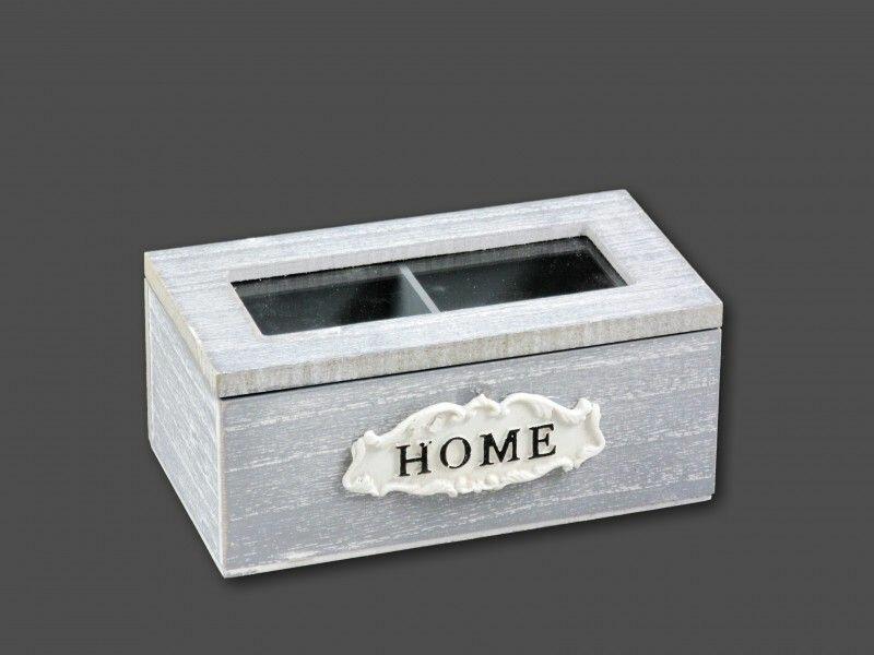 Teásdoboz kétrekeszes Home szürke 16x7cm 04611 Befoglaló méretek 16x9x7 cmAnyaga fa