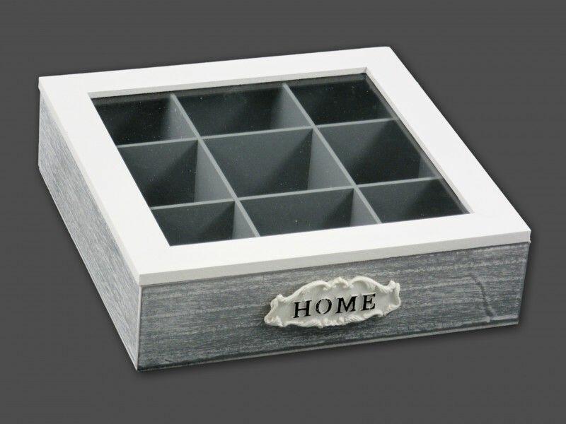 Teásdoboz Home 9 fakkos szürke 24x24cm 04613 Ez a gyönyörű fa teásdoboz 9 rekeszes, Home feliratozású, szürke/fehér színű, mely nem csak teafilterek tárolására alkalmas, hanem lakásdekorációnak is kiváló. Befoglaló méretek 24x24x7 cmAnyaga fa, üveg