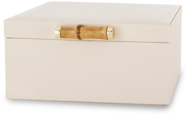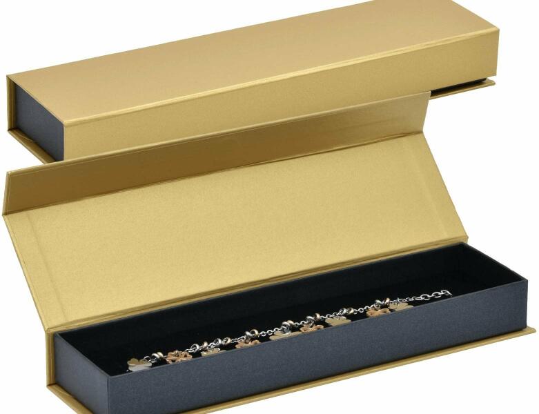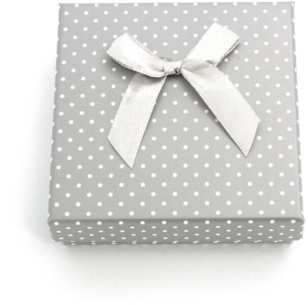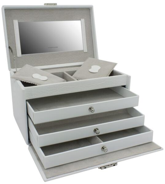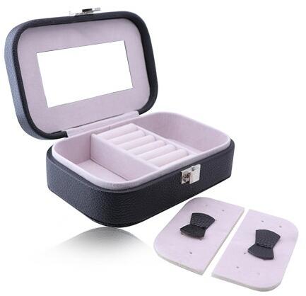 A téglalap forma utazási ékszerdobozt fekete műbőr fedi. Belül rózsaszín anyag borítja, egy tükörrel és három rekesszel ellátott. Kapcsos kivitel. A két oldalsó rekeszben kivehető és fogantyúval ellátott fülbevaló párna található. Külső méretek: 150 x 100 x 45 mm