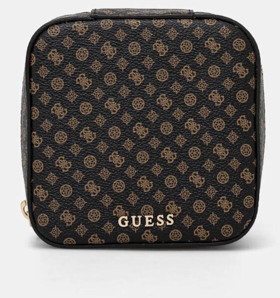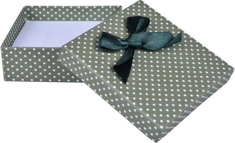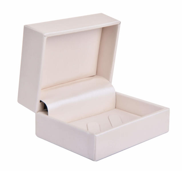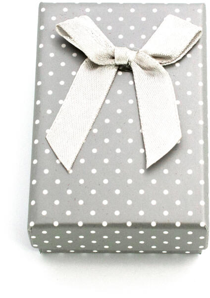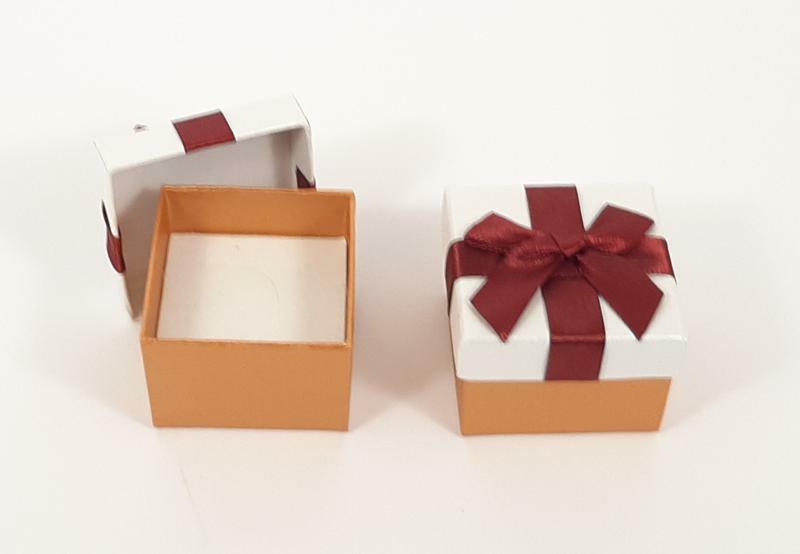 Papír ékszerdoboz, bronz színű alj, fehér tető, bordó masnival. Belsejében fehér párnácska, melybe gyűrű vagy fülbevaló is tehető. Mérete: 48x55x33 mm.