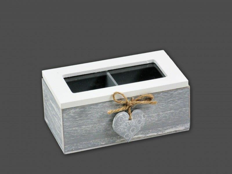 Teásdoboz kétrekeszes szíves szürke 16x7cm 04612 Befoglaló méretek 16x9x7 cmAnyaga fa, üveg