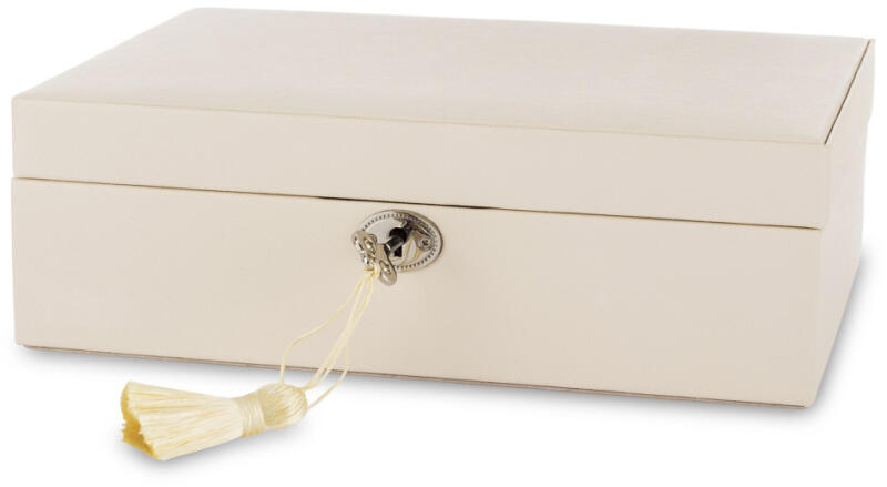 Krémfehér kulcsos zárható szögletes ékszertartó doboz osztott belső rekeszekkel 8,5x27x19cm A mindennapi életben fontos, hogy értékeinket, ékszereinket biztonságos és stílusos módon tároljuk. A krémfehér kulcsos zárható szögletes ékszertartó doboz nemcsak praktikus tárolóeszköz, hanem egy elegáns kiegészítő is, amely tökéletesen illeszkedik bármilyen enteriőrbe.