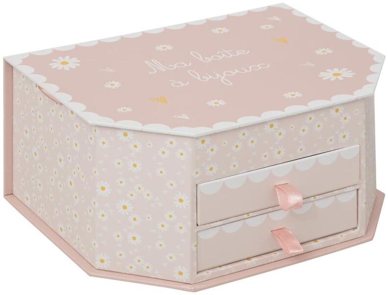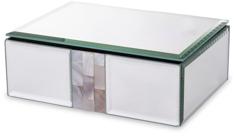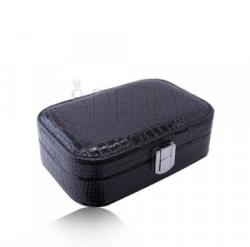 Fekete színű téglalap ékszerdoboz, melynek felülete fényes és krokodil mintás műbőr fedi, belül tükörrel és három világosrózsaszín rekesszel. A középső rekesz puha párnával ellátott, fülbevaló tárolására alkalmas. Az ékszerdoboz kapoccsal készült. Külső méretei: 150 x 100 x 45 mm