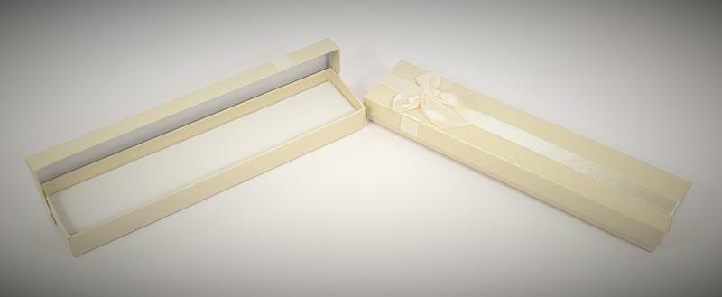 Papír ékszerdoboz, bézs színű, bézs masnival. Belül fehér párnácska, melybe nyaklán és karkötő is helyezhető. Mérete: 20x4x2 cm.
