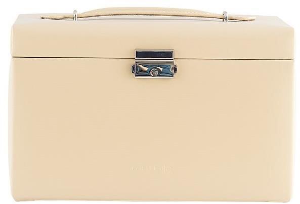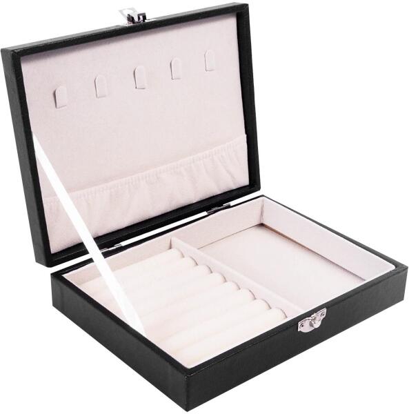ÉKSZER DOBOZ - BEAUTYLUSHH GYAKORLATI – a tok két szintből áll. Az első egy kihúzható fiók 9 kis rekesszel, amely lehetővé teszi például kis fülbevalók elhelyezését. A második szinten egy hosszú sor rekesz található görgőkkel a gyűrűk számára, és két nagy rekesz az oldalakon a többi ékszer számára, pl. láncok, karkötők, medálok, órák és sok más. A rendező