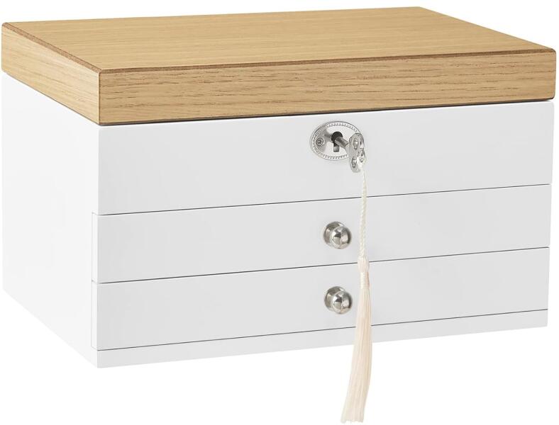Songmics 3 szintes fából készült tárolódoboz ékszerszervező tárolódoboz fiókokkal gyűrűk, fülbevalók, karkötők és nyakláncok számára [E LEGÁNS ÉS CHIC] Letisztult vonalak, elegáns fehér, stílusos fa erezetű fedél – ez a 3 szintes csecsebecsés doboz frissességet hoz otthonába, és elegáns kiegészítője a fésülködőasztalának 3 szint különálló részekkel: