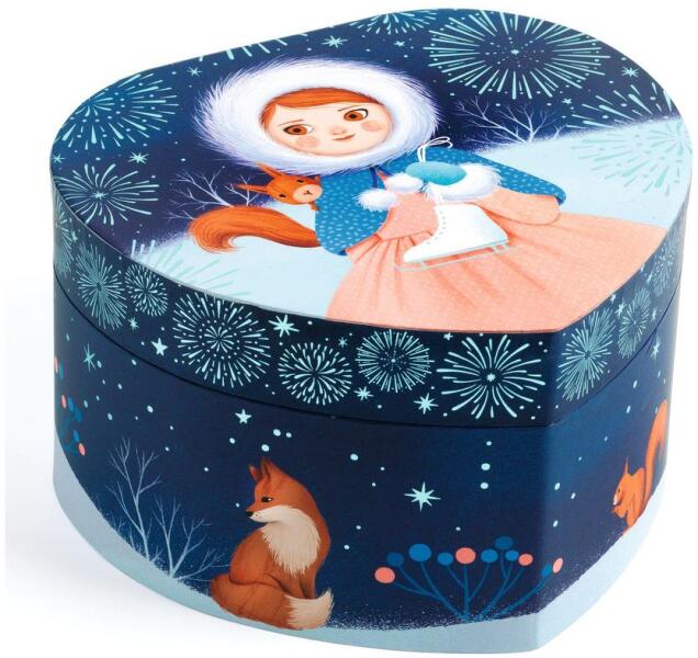 Szívecske formájú zenélő ékszerdoboz akár születésnapra. Miközben a kis korcsolyázó lányka körbe táncol "Leo Friedman: Let me call You Sweetheart" című zenéjére, kiválaszthatod, hogy melyik ékszereidet szeretnéd aznap felvenni. Az ékszerdoboz fából készült, belseje kék plüss bevonatú. Lehet fülbevalókat, karkötőket és nyakláncokat tartani benne. A lányka figura