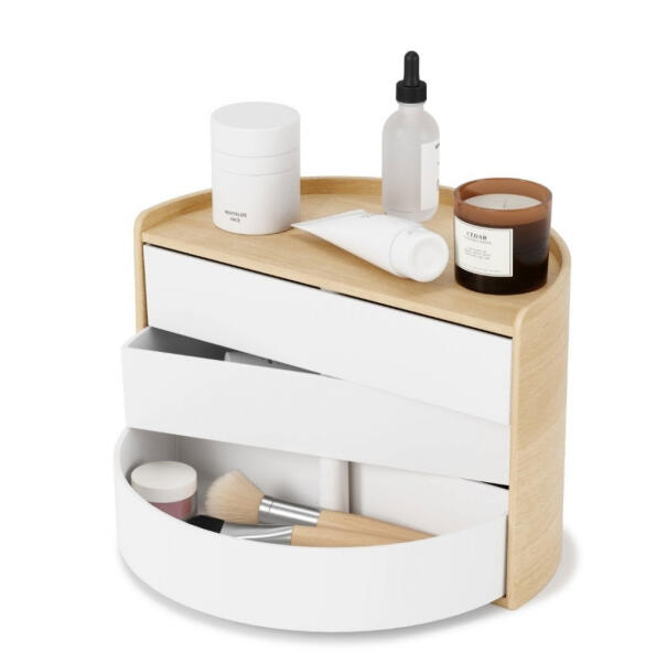 Elegáns és praktikus Umbra Moona ékszertartó doboz, amely három 360°-ban forgatható fiókkal és tágas felső tálcával rendelkezik. Modern skandináv design természetes fa és fehér színkombinációval, tökéletes kiegészítő a hálószobába vagy gardróbba. Innovatív tárolási megoldás stílusos kivitelbenAz Umbra Moona ékszertartó egy egyedülálló, körformájú tárolór