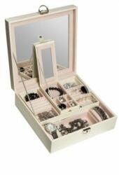 Krémfehér kulcsos zárható szögletes ékszertartó doboz osztott belső rekeszekkel 8,5x27x19cm A mindennapi életben fontos, hogy értékeinket, ékszereinket biztonságos és stílusos módon tároljuk. A krémfehér kulcsos zárható szögletes ékszertartó doboz nemcsak praktikus tárolóeszköz, hanem egy elegáns kiegészítő is, amely tökéletesen illeszkedik bármilyen enteriőrbe.
