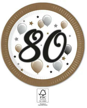 Milestone, Happy Birthday 80 papírtányér 8 db-os 23 cm FSC Anyaga: papír Méret: 23 cm 8 db tányér/csomag FSC (Forest Stewardship Council)