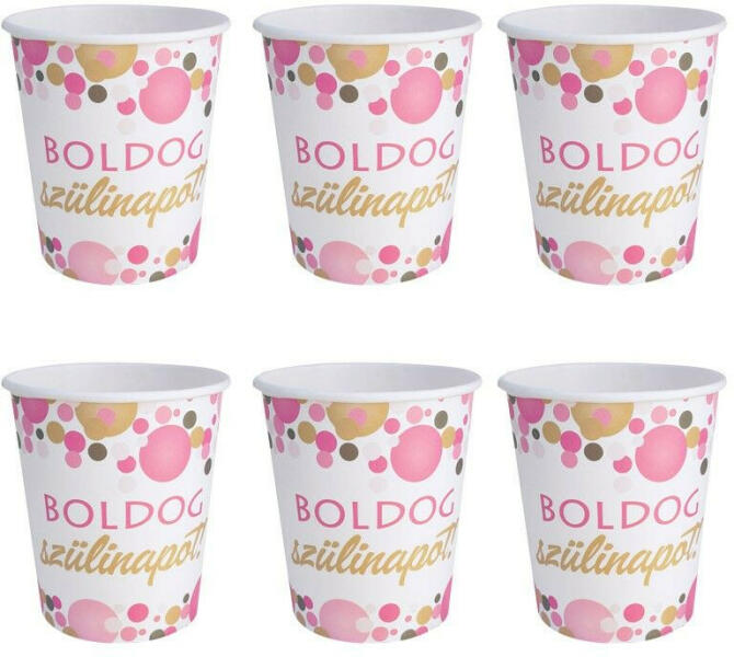 Boldog szülinapot feliratos, papír anyagú parti pohár, pasztell rózsaszín színben, konfettis mintával lányoknak. Boldog szülinapot feliratos, papír anyagú parti pohár, pasztell rózsaszín színben, konfettis mintával lányoknak. Mérete: 250 ml. Anyaga: papír. 6 db pohár/csomag.