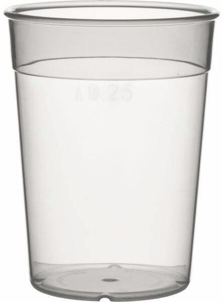 Egymásba rakható, többfunkciós, Gastro műanyag pohár, 0,25 l-nél mércével. A pohár tejesszínű, és törhetetlen. Mosogatógépben mosható. Óvodáknak, kórházaknak ajánlott, vagy akár nagyobb összejöveteleken is hasznos lehet, mint például fesztiválokon, koncerteken és vásárokon.