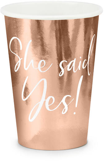 Party pohár, 6 db/csomag, 220ml. Elegáns, rosegold színben, She said yes! felirattal.
