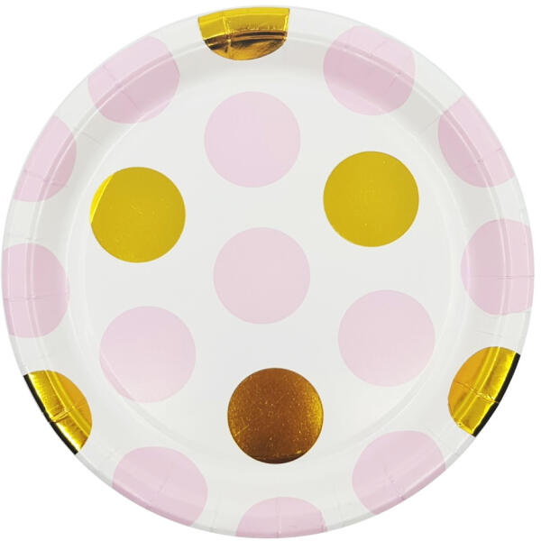 Varázsolj eleganciát és stílust bármilyen ünnepségre ezzel az arany és rózsaszín pöttyös papír tányérral , mely tányérok vidám kiegészítői lehetnek bármilyen parti dekorációnak, legyen az születésnap, esküvő, babaváró buli vagy bármilyen különleges esemény. Tulajdonságok: Anyaga: papír A tányér átmérője: 18 cm Kiszerelés: 10 darab/csomag Tedd különlegess