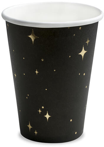 Papír pohár, 6 db/csomag. Űrtartalom: 260 ml. Elegáns fekete színű, arany csillag motívumokkal díszítve. Az eldobható papír poharak minden felnőtt party és gyerekzsúr hasznos kellékei. Amellett, hogy környezetbarát termékek, még mosogatni sem kell.