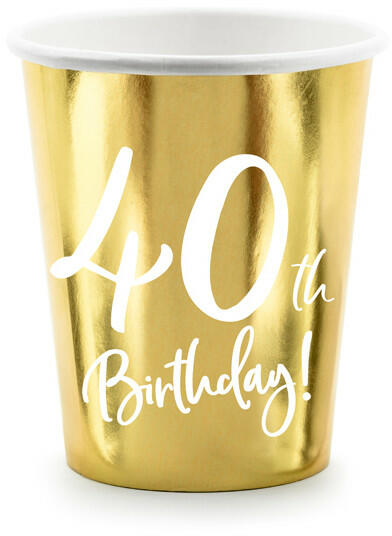 Papírpohár, arany, 40. születésnap felirattal. Mérete: 220 ml. Anyaga: papír. 6 db pohár/csomag.