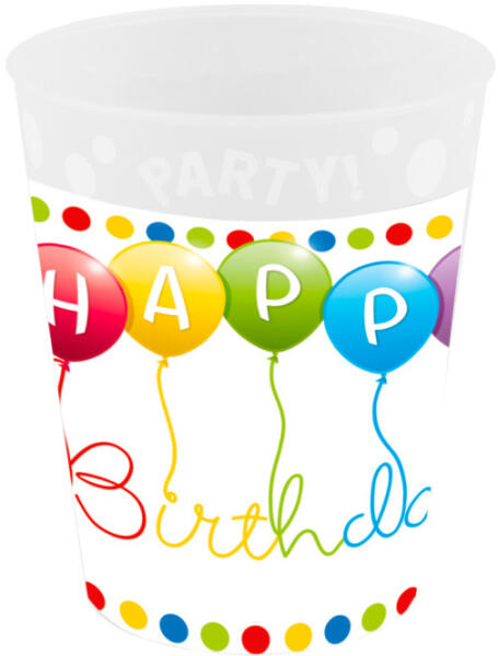 Happy Birthday micro prémium műanyag pohár Anyaga: műanyag Űrtartalom: 250 ml 5 percig mikrózható 600 W-on. Mosogatógépben mosható.