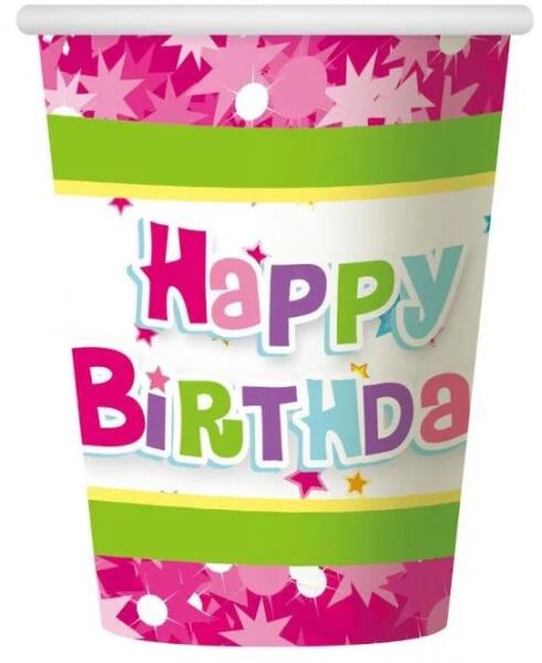 Happy Birthday Pink papír pohár 6 db-os 270 ml 6 db pohár/csomag Űrtartalom: 270 ml (9x7cm) Anyaga: papír