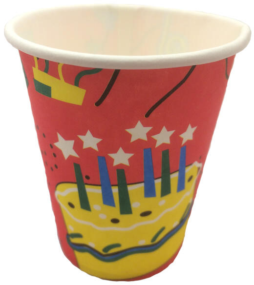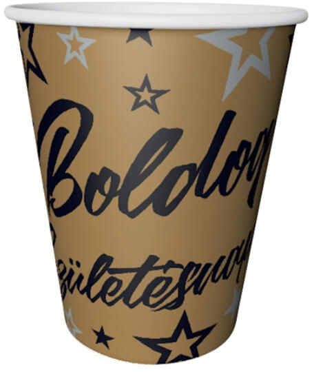 Papír pohár, 8 db/csomag. 2,5 dl. Arany, csillag mintákkal, Boldog születésnapot felirattal. Az eldobható papír eszközök minden felnőtt party és gyerekzsúr hasznos kellékei. Amellett, hogy környezetbarát termékek, még mosogatni sem kell.