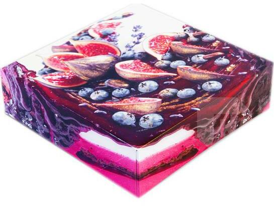 "Négyzet alakú tortadoboz tömör papírból, színes nyomtatással. Alkalmas sütemények, torták, péksütemények, kekszek szállítására is... Méretek: 28 x 28 x 8 cm ".