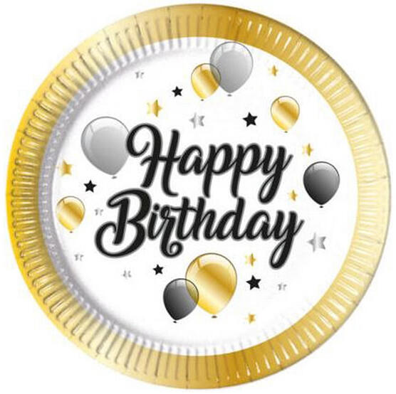 Papír tányér, fehér, arany szegéllyel, Happy Birthday felirattal 8 db/csomag. Méret: átmérő 23 cm.