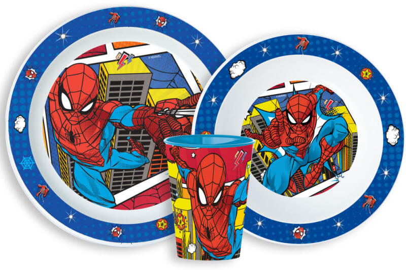 Spiderman, Pókember étkészlet, micro műanyag szett -BPA Mentes -Származási ország: Spanyolország -A termék környezetbarát, újrahasznosítható anyagból készült a Föld védelmében. Csomagolás nélkül! A készlet tartalma: 1 db mélytálka (Mikrózható műanyag) 1 db lapostányér (Mikrózható műanyag) 1 db pohár 260 ml (600 watton mikrózható max. 2 percig) A termék anyaga: