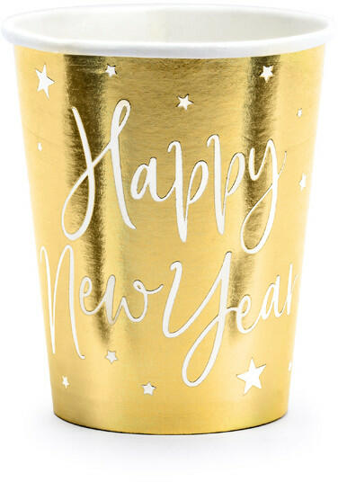 Papírpohár, arany, Happy New Year felirattal. Mérete: 220 ml. Anyaga: papír. 6 db pohár/csomag.