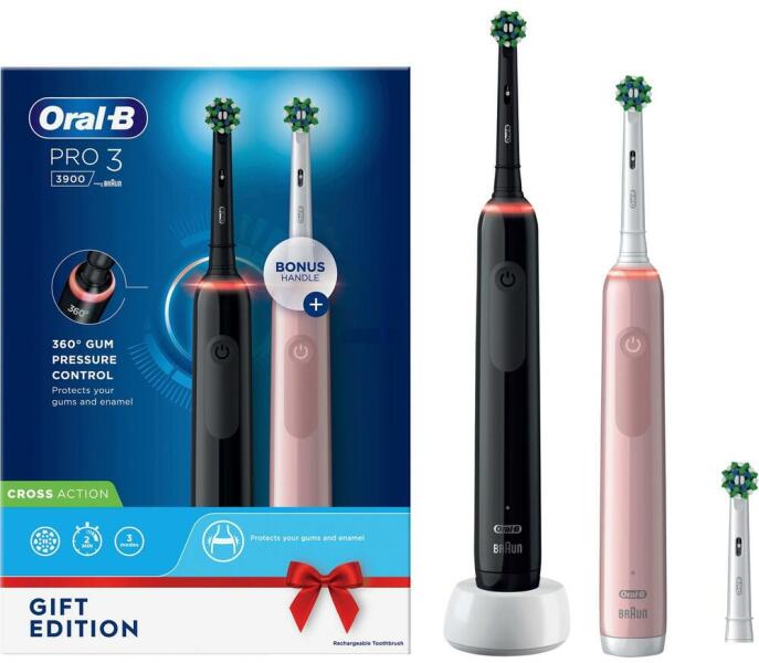 ORAL-B PRO 3 3900 ELEKTROMOS DUÁLIS SZERELÉK . A forgó fogkefe ORAL-B Pro 3 3900 már az első használat után fehérebbé teszi fogait, mivel gyorsan eltávolítja a felületi szennyeződéseket. A fogkefe eltávolítja 100%-kal több lepedéket és 100%-kal egészségesebb ínyt biztosít 30 nap alatt, mint egy hagyományos kézi fogkefe. A kerek kefefej alaposan körbejár minden egyes foga
