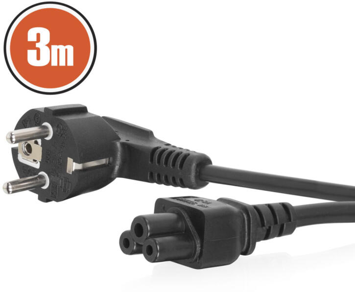 Hálózati tápkábel notebook-hoz 3,0 m Hálózati tápkábel notebookok tápegységéhez. 90°-os dugóval Fekete Csatlakozók típusa:IEC C5 aljzat - 90º-os CEE 7/7 dugóMax. terhelhetőség:16A / 250VBelső erek:3 x 0,75mm2Szigetelés:DuplaSzín:FeketeHoss z:3 m
